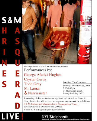 I will be participating in a performance by African artist George Afedzi Hughes tomorrow @ N.Y.U. (see details below)! I have to be at the gallery 2 hours early to take part in a rehearsal. Its been requested that we wear all black, even black shoes, but will be wearing a blue mask that features the written African symbols, reference an executioner. The performance will feature myself and four other students as we accompany George. I plan on having someone document the performance with photography and will be sure to post the documentation here.