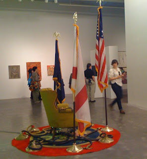 My personal favorite was the piece shown above by an artist whose name sadly, I forget. Clothes and other personal items were purchased from individuals in Japan. The items are on display on various platformed surfaces. I enjoy the idea of the artist finding “art” in the private pockets of others and the piece is surrounded by loosely painted oil paintings of men and wrestlers by yet another.