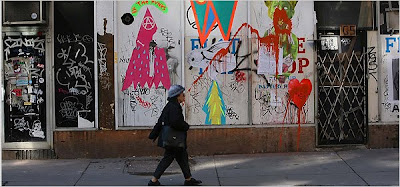 Painted into the composition is a moment of disturbance. A “splash” if you will, purposefully defacing the image that now becomes an entity unto itself. My New York eyes thought of the Splasher, the street artist who was throwing/splashing paint onto the walls of New York buildings a few years ago.