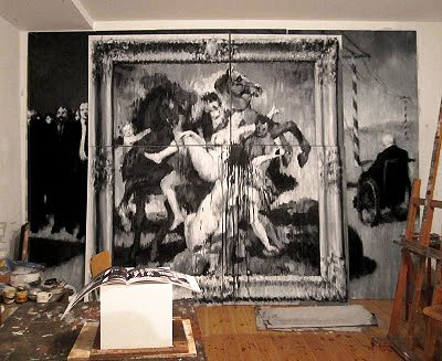 One of the things I love about getting to visit an artist studio, is that you never know what you will see. Sure, you may be familiar with his/her work, but you’ll never truly understand the inner workings until you are privileged enough to step inside the studio space. Such was my experience upon visiting Kai Teichert’s studio for the second time. Previously, he showed me some of his smaller scale paintings that engage both in a fantastical and representational way. Upon the second visit, during conversation, he mentioned some of his older work which is predominately in black and white. The paintings are so large that they must be “assembled” placing smaller canvases on top of each other to form the larger-scale final image. The piece above depicts a reproduction of Peter Paul Rubens, Rape of the Daughters of Leucippus, and even the decorative frame is constructed in paint, within the structure of the stretcher bars.