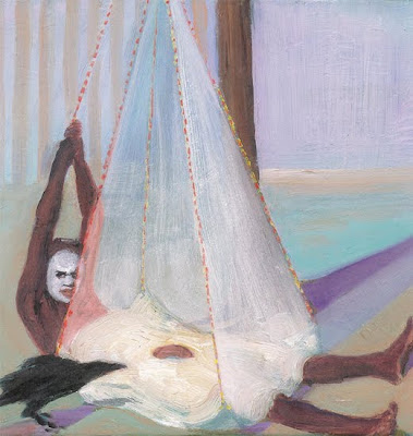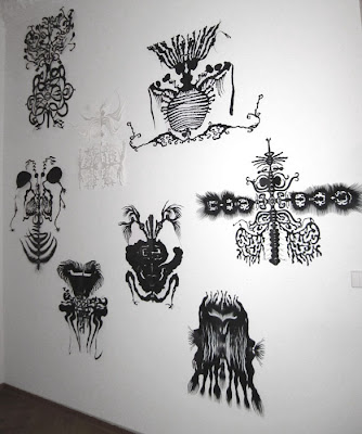 Yesterday evening I was fortunate to have a studio visit with Australian artist Deborah Wargon, who has lived in Berlin for the past seven years. She has been working on a series titled: The Wiedergutmachung Project where she investigates the complexities of Jewish identity from a historical European context and how it relates to her own experience. Her most recent work, shown above, hangs delicately on studio walls having been made filtered through the subconscious. The work is monochromatic all but for one “albino”. It channels the craftwork of masking, buzzes with a brimming sexuality along with a post Apocalyptic otherness.