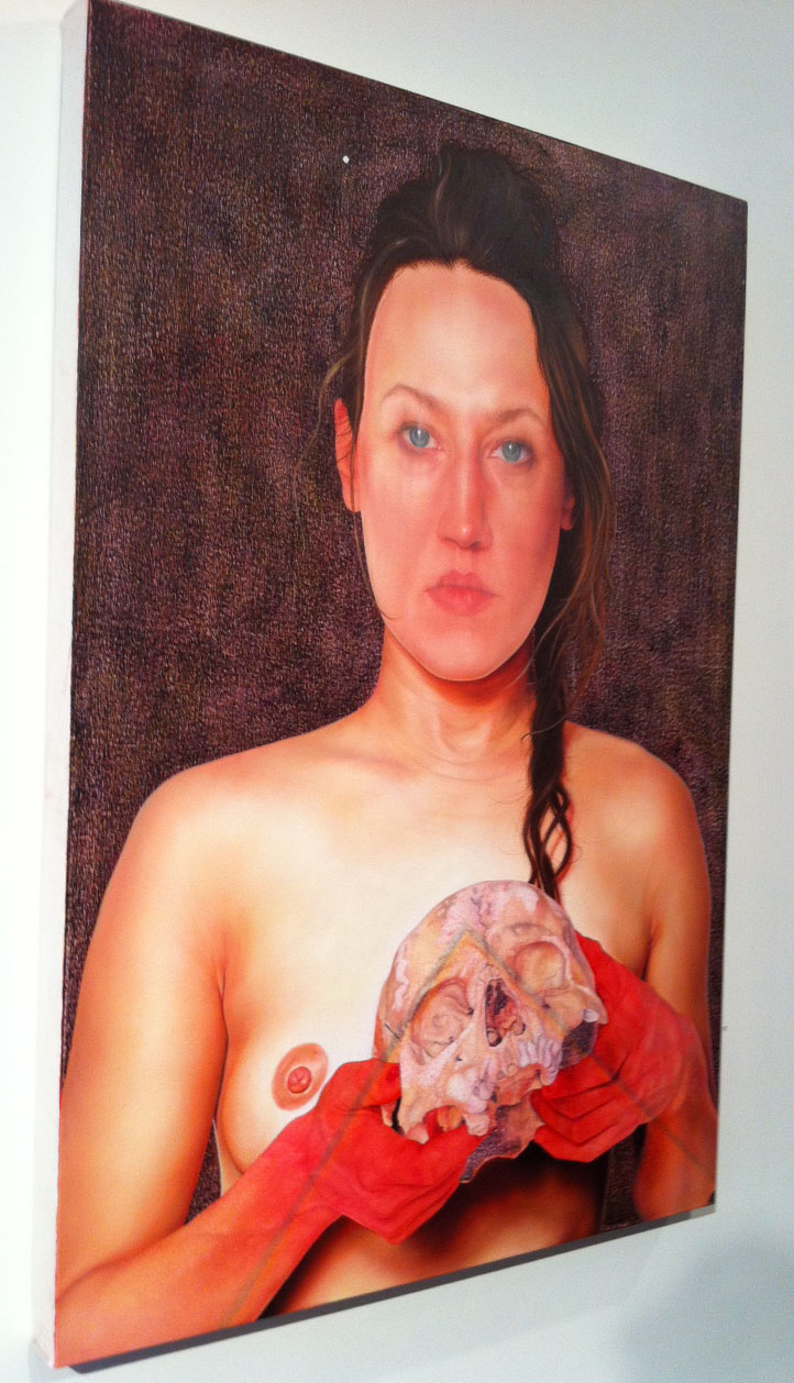 Currently on view at Like The Spice Gallery in Williamsburg, is Jenny Morgan: One and the Many. For this, her second solo exhibition at the gallery since 2009, Jenny once again revisits the naturalistic figure in occasionally unnatural hues. Her paintings feature friends as well as several self portraits. Upon entering the gallery, director and founder Marisa Sage, was giving a welcome speech to the eager crowd. This was something that I had yet to see at an opening, but I admire Marisa’s obvious dedication to the gallery and artists. Her speech also kicked off Williamsburg Every 2:nd and Learn To Collect, now sponsored by At&t. My friend Penny and I wandered to the back of the space and wine in hand, proceeded to take in the crowd, spotting friend Barnaby Whitfield, and also the work.