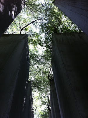 Entering the exhibition space which commences subterranean one level below the ground, we are led through a maze of objects locked away in glass boxes. Ranging from packages never opened to handkerchiefs and photographs, they are remnants of the Holocaust and personal affects for many who never returned from the camps in which they were sent and detained. I felt a twinge in the pit of my stomach as I shuffled from container to container reading the stories compiled by survivors and now on permanent view. This particular section finishes in a triangular room with high angled walls and small slivers that reveal natural light. It happened to be a sunny day, and for that I was grateful.