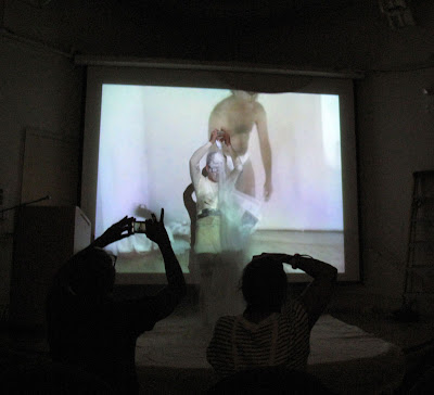 At the time of his death, Michael Richards was making sculptures, casting his own body and commenting on the Tuskegee airmen, a squad of African American Air Force pilots who were segregated during WWII. One in particular, Tar Baby vs. St. Sebastian (1999) has the artist as St. Sebastian but instead of being pierced with arrows, his body is pierced with airplanes. Very striking not only in the context of a overlooked subject, but also regarding his own untimely demise.As the performance began, Gerry spoke of his friendship with Michael and his own experience living near Ground Zero and being there in 2001. Months after the attacks, dust of the dead and debris from the collapsed buildings still found its way into his home. The performance uses the body as organic matter, standing at full height, a tower. The artist proceeded to wrap the audience in yellow caution tape. He then pulled the tape back towards the stage and entwined his body. During the live action a video of the same performance from 2006 looped on a large screen on the stage. The duality of body and movement was very powerful and Gerry was a doppelganger unto himself; one in three dimension the other in two dimension.