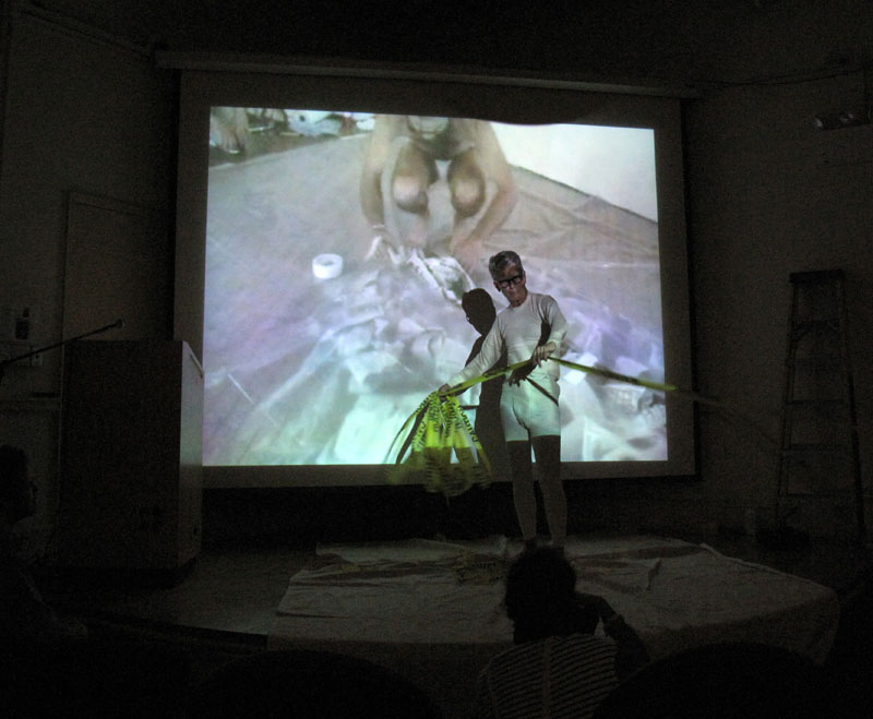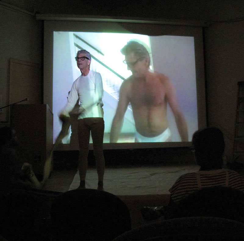 At the time of his death, Michael Richards was making sculptures, casting his own body and commenting on the Tuskegee airmen, a squad of African American Air Force pilots who were segregated during WWII. One in particular, Tar Baby vs. St. Sebastian (1999) has the artist as St. Sebastian but instead of being pierced with arrows, his body is pierced with airplanes. Very striking not only in the context of a overlooked subject, but also regarding his own untimely demise.As the performance began, Gerry spoke of his friendship with Michael and his own experience living near Ground Zero and being there in 2001. Months after the attacks, dust of the dead and debris from the collapsed buildings still found its way into his home. The performance uses the body as organic matter, standing at full height, a tower. The artist proceeded to wrap the audience in yellow caution tape. He then pulled the tape back towards the stage and entwined his body. During the live action a video of the same performance from 2006 looped on a large screen on the stage. The duality of body and movement was very powerful and Gerry was a doppelganger unto himself; one in three dimension the other in two dimension.