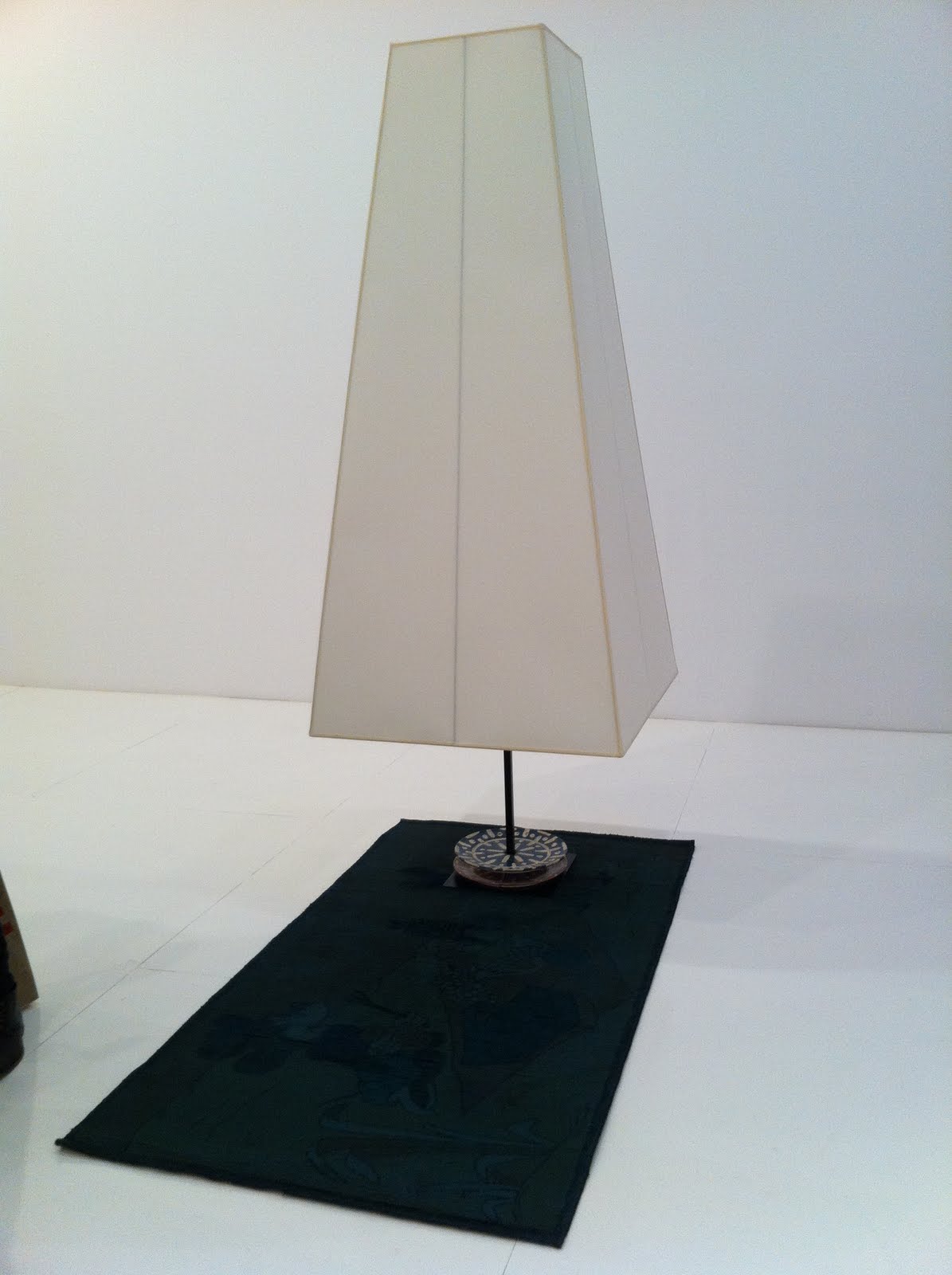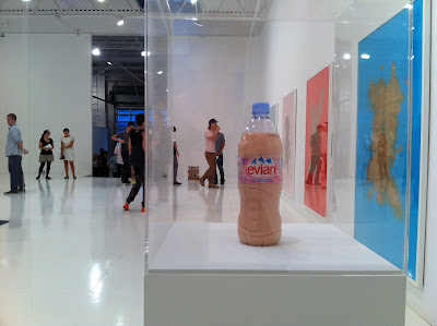 In her series Firm Beings, shown in the first photograph above, Pamela Rosenkranz refills water bottles with liquid that takes on various shades of human flesh. The result is not necessarily thirst quenching, but is the artist’s way of commenting on “designer” waters and Socio-demographics. The verticality of the water bottle is far from a figure in standing position, however, in a hint of irony she chooses to impose upon this commercial product changing its visual appeal and clarity. Also included is the series The most important Body of Water is Yours (Uniquely balanced, unlike Anyone else) which consists of brightly colored paintings on spandex. The size of each work is established based on the standard measurement of an emergency blanket. In both particular bodies of work she challenges the viewer by not giving obvious clues into her artistic agenda.