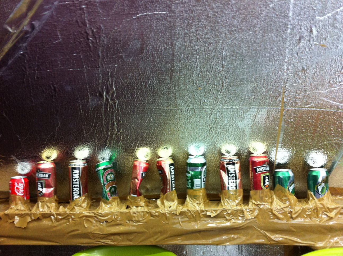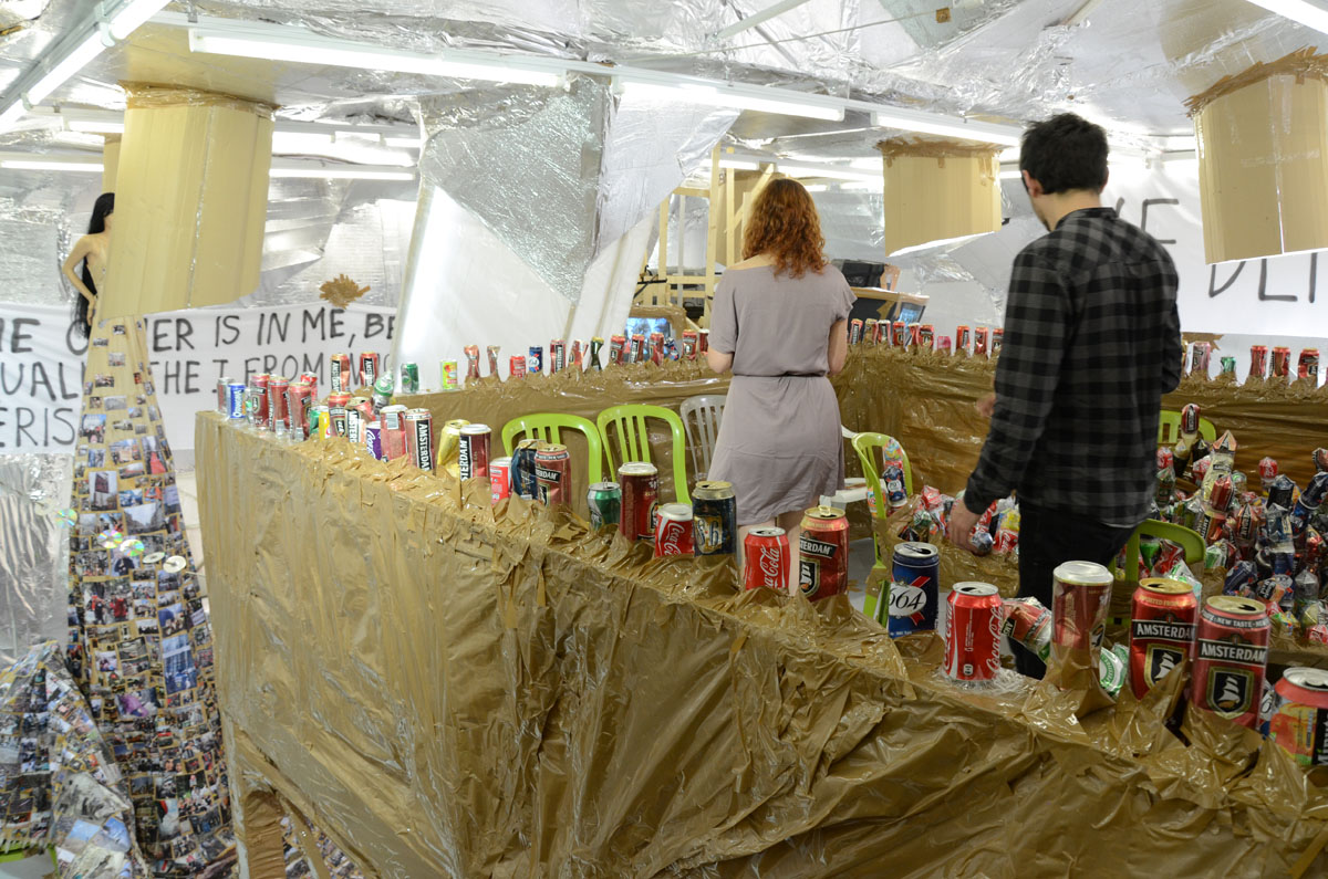 Everyday items have been placed on crudely constructed shelves and walls covered in tin foil. As is usual with Hirschhorn installations, Duct Tape is everywhere and alludes to a binding material wrought with impermanence. The environment is almost like a living space and is both inviting and standoffish. Many visitors walked amongst the objects taking in the juxtapositions of familiarity in the recognizable (cell phones, beer cans, exercise bicycles) and the foreignness of death represented very candidly in the 4″ x 6″ photographs that are woven into almost every field of vision.