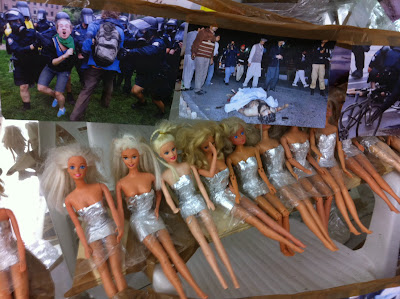 Thomas Hirschhorn forces the viewer to look at death. He compiles images from the Internet and other stock references and makes a visual narrative based on political disruption and strife along with items that for most would be considered to be excessive. For Crystal of Resistance he utilizes the shape and form of the crystal to reference love. In a New Age sensibility the crystals are taped to objects ranging from Barbie Dolls to cell phones in what almost appears to be a desperate notion of respite.