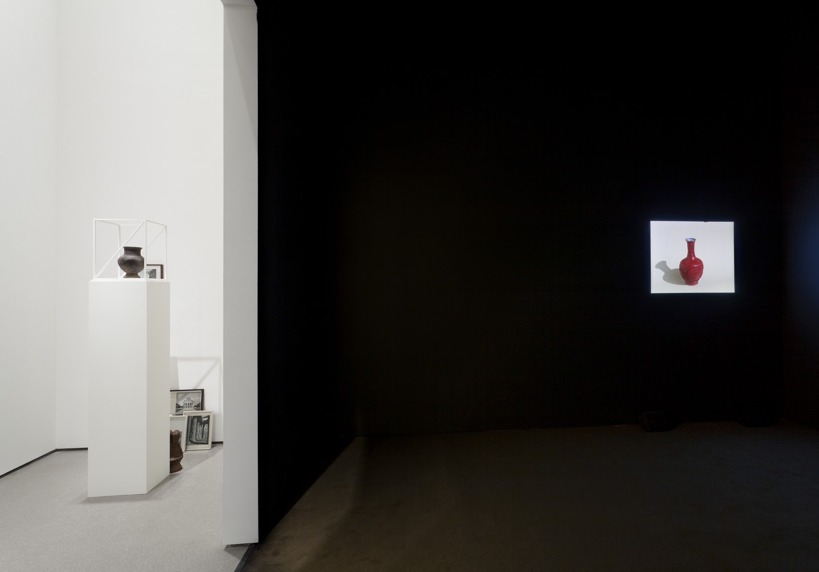 Each object in the installation carries with it a strong sense of specificity. The walls and columns are white, so any hint of color whether in a photograph or sculpture, seems to vibrate with a certain kind of raw energy. At the basis of the exhibition is Chronicles (2010) a three-channel video projection The room where Chronicles is being shown is completely black, in contrast to the whitewash of the other rooms. The layout of the projection in space invites the viewer to move around, looking and comparing one screen to the next. The movement is slow and precise. Each short segment has been transferred from Super 8 film to video and features assorted content. One is a documentation of sorts of various ancient artifacts from different cultures shown in front of a color blocked space, or appropriated directly from the pages of a book. Another film shows views of the Acropolis while the third presents superimposed palm trees in a desert. The mirage is a metaphor, a visual notation referencing isolation of cultures and civilizations that have faded away long ago.