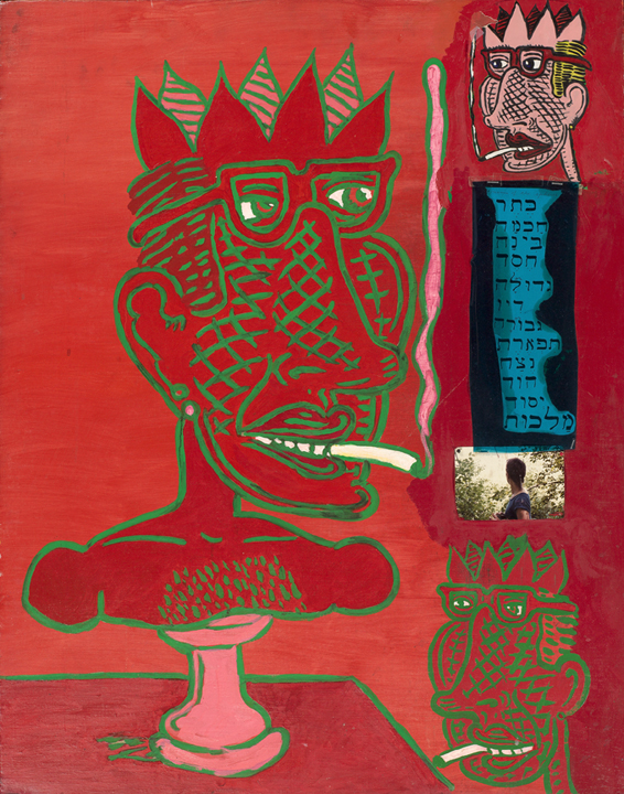 Oil, acrylic, paper, plastic, color photograph on canvas mounted to wood.