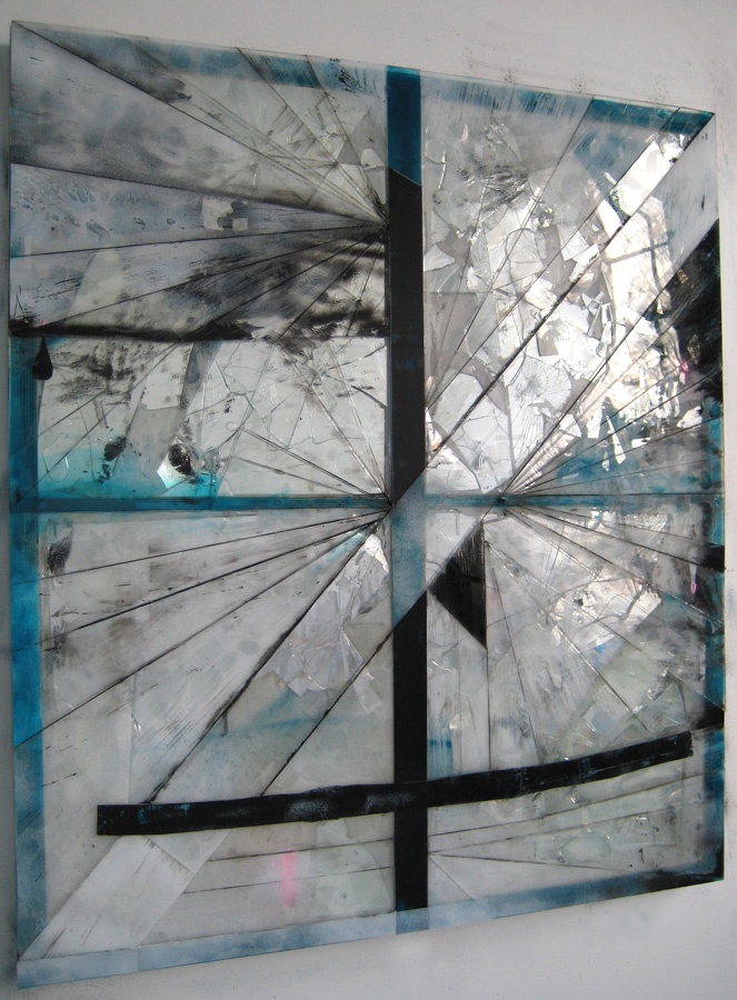 At the heart of Jason Gringler’s work is a lyrical destruction. For his large pieces, the artist uses Plexiglas, spray paint, mirrors and tape. He makes paintings that are almost entirely void of paint. However the works are in an active dialogue with a history of mark making as recent as the Action Painters and yet makes a valuable notch in a contemporary abstract discussion as well. His work is both sculptural and flat. It’s compressed space that exists within a frame and is an organization of chaos. I asked the artist about music because while looking at the work I found myself thinking of audio composition and the way that sound dissects air. In 2005, Banks Violette exhibited the structural remains of a burned church at the Whitney Museum composed entirely of salt. The work was accompanied by a soundtrack, commissioned specifically for the piece by then post-imprisoned Norwegian black metal guitarist Snorre Ruch of Thorns. In the cracked and precisely placed pieces of broken mirrors and plastic Jason Gringler is a composer of space, a painters non-painter. In my mind’s eye or rather ear, the work, as if a cauldron of visual seduction conjured its own soundtrack. A melodic, if piercing scratch of intersecting chords disguised and presented as linear traces.