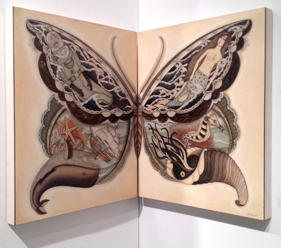 Some of the featured artwork felt much more realized than others. Such is the case with the dapper gents who sat representing the Red Truck Gallery based in New Orleans. The painting shown above, is a surrealistic narrative love affair between an astronaut and a mermaid. The artist has obviously honed in on his craft and the style of the piece resonates visually and thematically with tattoo culture. It is here, hidden in the term “narrative” where my conversation with Dealer Stephen Romano comes into play. When asked to define outsider art, we started to have what could have been quite a long conversation. Something that I latched on to, was his determining that the narrative is more important than the execution or the piece itself. In this day and age, most contemporary artists shiver at the use of the term narrative, so it makes sense that an outsider artist would embrace it. Several of the galleries present, including the booth of RHD (Resources for Human Development), whom Mr. Nomura represented and assisted in facilitating their presence at the fair, featured artists with severe mental and physical disabilities. A woman whom I spoke with who is the director of Oasis Art Center in Philadelphia and associated with RHD, Pat Lyons, said that she has been present for much of the art making process and that for her outsider art is “the authenticity of tapping into a joyous simplicity”. For many individuals who remain outside of society either due to physical and mental restraints, or even incarceration, the act of making something regardless of skill level or background lends itself to a form of communication even in the most rudimentary terms. For the general public, social networking is a tool that once unlocked opens the door leading to possibilities in a world ripe with global communication. According to Stephan Romano, this social skill is a continuum that is taught to young artists with fervor in an academic setting however outsider artists never have this chance and instead of discovering an asset, are faced with challenges and obstacles, which for the average person are not far out of reach. In the end, a determination can be surmised that art is going to be executed, it will be made and sold, regardless of labels, educational training and social status everyone has a chance to find his/her own niche whether you land outside or inside the box.
