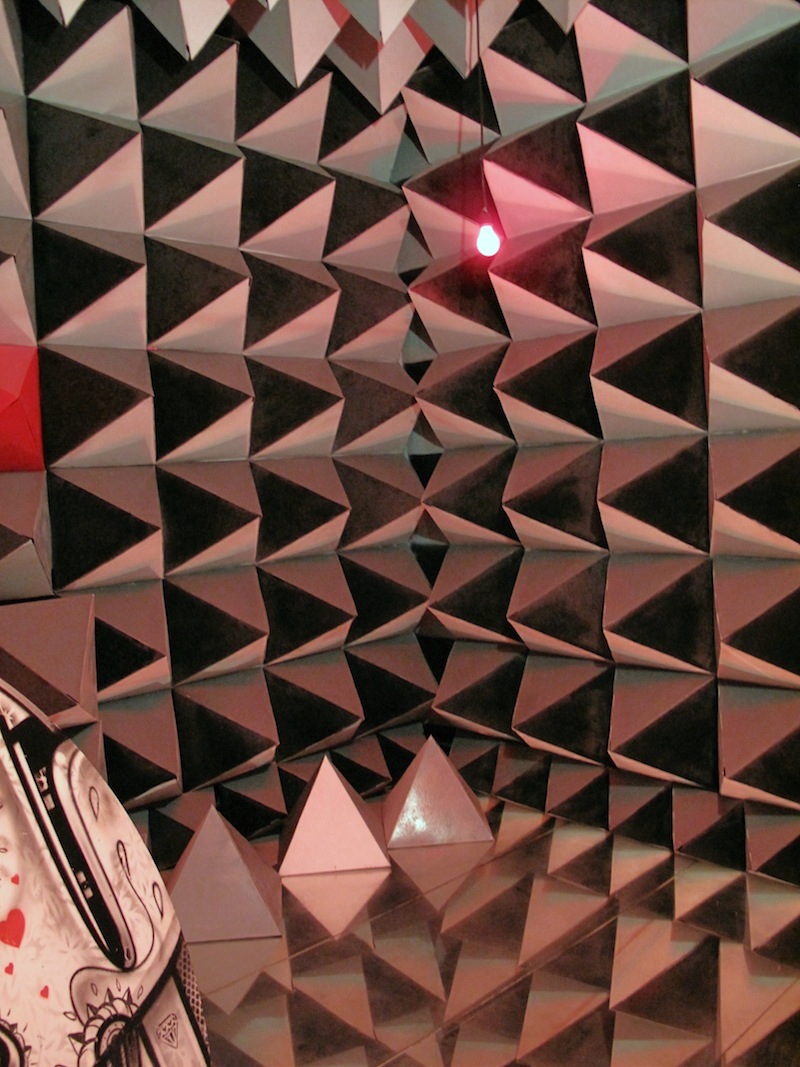 The second floor is where most of the artists have made site specific installations. Each individual or artist group involved was assigned a room to make work. The rooms are similar in format and some are adjoined by adjacent bathroom facilities. That said, even if the deserted bedrooms were once originally similar they now each have a specific flavor and aesthetic that varies from artist to artist. Another favorite of mine is by Scherezade Garcia in collaboration with the Lehman College Art Gallery. The room has literally been turned upside down. Furniture has been attached to the ceiling and the opposite wall contains a wallpaper installation of portraits of the late Andrew Freedman himself. It’s as if the artist conducted a seance in order to conjure the ghost of the original owner and in doing so, flipped the contents of the room.