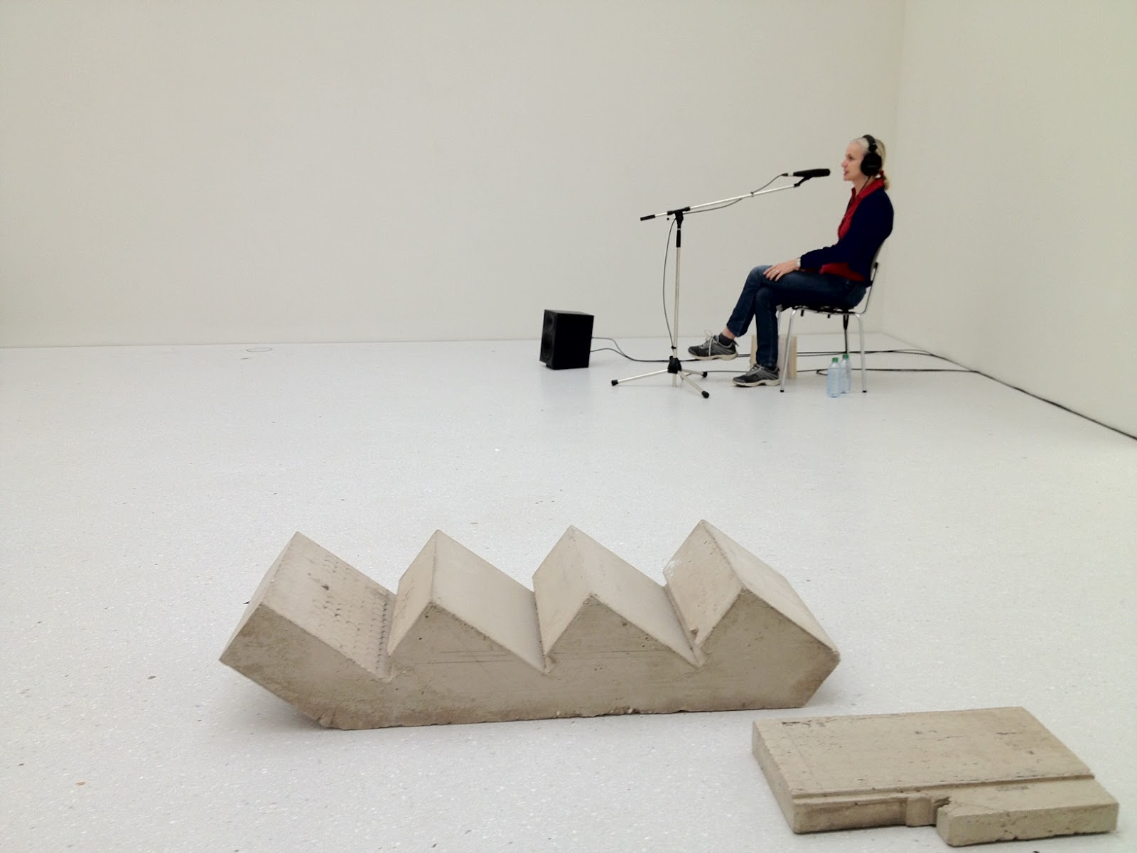 Finally, upon deftly locating and entering the Neue Galerie, one will be directed upstairs for dOCUMENTA (13) artworks and greeted first by Il Processo, 2010-2012, by Rosella Biscotti a 6 hour audio loop with 9 sculptures in reinforced concrete and variable dimensions. The audio is in Italian however also as part of the piece, is a translator who is interpreting the Italian audio to English in real time. She sits calmly, in the adjacent room (along with the concrete sculptures) and recites the text in English as heard via headphones. The effect is an assimilation of abstraction, sculpture, realism and journalistic documentation. Combined with the sculptures, heavy objects that are completely nondescript, the juxtaposition of the audio recording, live translator and inanimate objects makes the piece quite compelling. Biscotti, born in 1978 in Molfetta, Italy now is based in Amsterdam. She started her research into this particular project in 2006, focusing on a courthouse which later was transformed from courthouse to a sports museum. Previously, the location hosted some of the most controversial trials of Italian history, including a trial against the extra-parliamentary group Autonomia Operaia, who were accused of being responsible for Italian terrorism in the 1970’s. Before the building underwent extensive renovations, Biscotti was able to cast architectural elements from the courtroom in concrete, and it is these sculptures which are part of the exhibition. With Il Processo, the artist succeeds in reinventing a moment in history in a way of using both a live body (translator), recorded material, and sculptures that are a direct reference to the original location. She has made a monument from something that was only available in one format and now exists as a three-part whole.