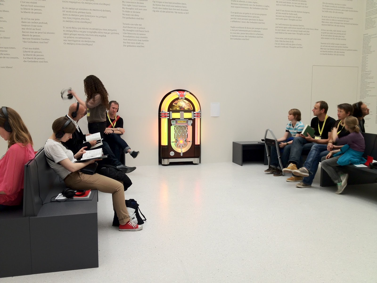 Also in the Neue Galerie is the work of American born, London based artist Susan Hiller who has set up a jukebox with a working playlist. “Die Gedanken sind frei (Thoughts are free)” is a soundtrack that has been selected for the 100 days of dOCUMENTA (13). The location at the Neue Galerie is only one of five. Conceptually following the subjectivity of much of the work in dOCUMENTA (13) Hiller has chosen songs with specific themes coinciding with political history, language, memory, and the power of the individual. Sitting on the hard, black benches and putting on the large headphones, viewers are invited to listen or to also peruse the provided song book with the list of songs on the jukebox and lyrics. The selection is a fusion of time, place and culture utilizing songs that are from the past to current radio hits. This all somehow makes sense in the exhibition context as a whole. After walking all day, the opportunity to sit and listen to music is a welcomed moment of respite. I eagerly flipped through the large song book, looking for something I might want to add into the playlist. I chose “She Works Hard for the Money” the 1983 gem by Donna Summer. I walked up to the glowing jukebox and punched in the numbers, however my song was not the next selection. My initial thought was that as in a regular “non-art” jukebox, the cue sometimes gets backed up and one may never get to hear his or her song choice by the end of the evening.