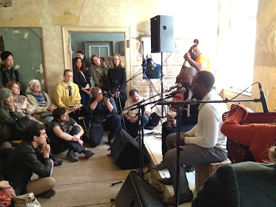 Theaster Gates, a Chicago, Illinois based artist is showing in dOCUMENTA (13) presenting 12 Ballads for Huguenot House. The piece involves a performance with Gates and other musicians as well as a physical intervention within the Huguenot House which was a residence and hotel that had been abandoned since the 1970’s. The artists goal was to “bring life back into the home” and he used discarded material from yet another abandoned building in Chicago, working with and transforming the interior of both spaces, creating very subtle yet substantial changes. Inside and on the 2nd floor, the artist is performing a bluesy style of music, tapping his foot and accompanied by a cello, bass, and a few other instruments. The active singing brings in not only an active audience, but on the occasion of this particular exhibition, the artist was also visited by an older woman (seen in the photo to the left) who was an original occupant of the home and spent her childhood their. After one of the songs, Gates introduced the woman to those present. He spoke on his experience of meeting her, and her surprise at being able to re-enter the home after it being abandoned for so long. She was teared up as he spoke and the artist himself was crying as he relayed her story of how she remembered hiding in the basement as a child during the war. Then the artist stated, “We worked in this home [making the installation] for several months and were thinking about art, but after meeting this woman I realized that it’s not about art at all, it’s about life.”