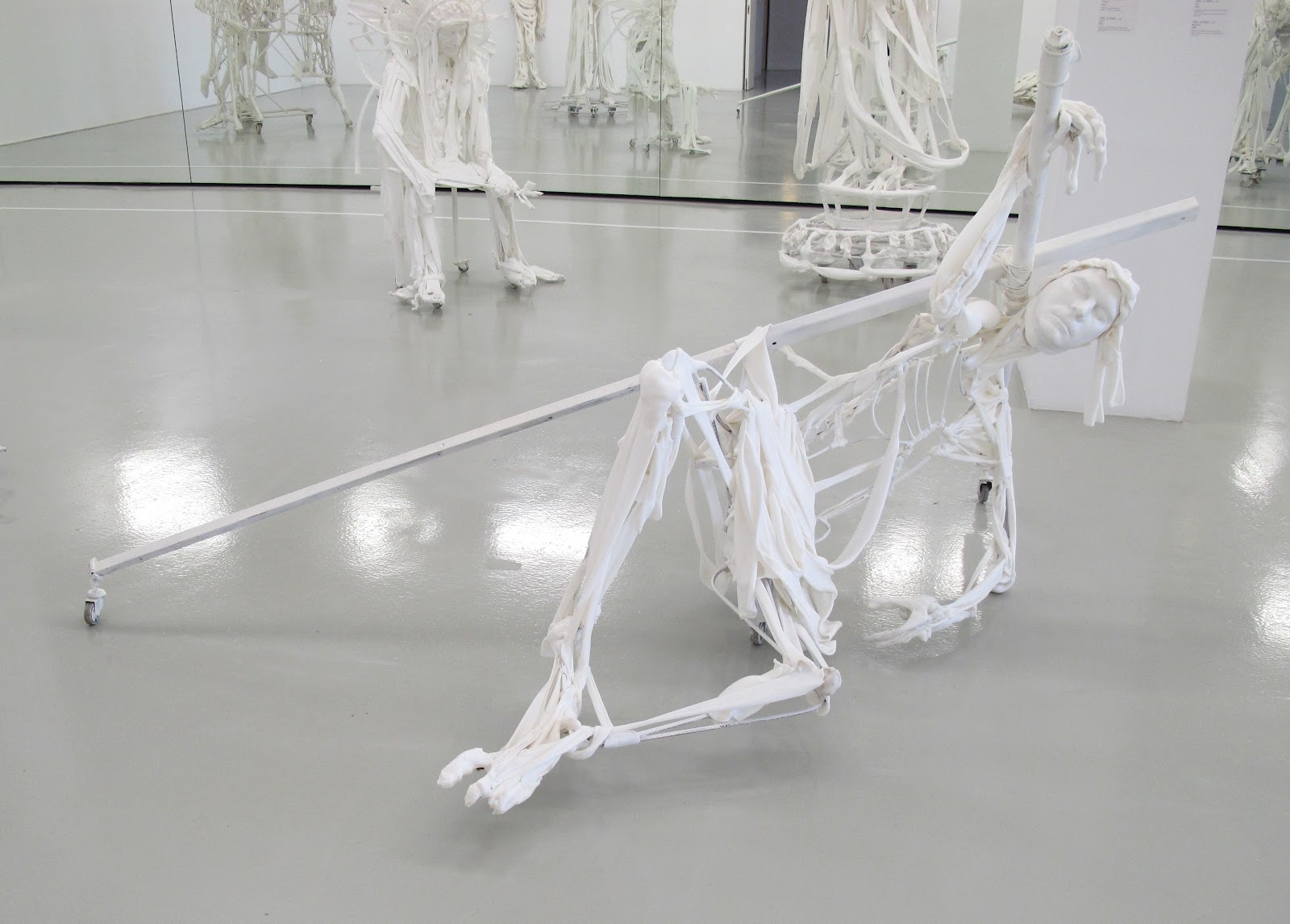 The exhibition at the DESTE Foundation Athens is quite different from the show in Hydra. On the second floor is work by Pawel Althamer (b. 1967). The first gallery presents a several sculptures from the series titled Almech, making direct reference to famous art world personalities, including Dakis Joannou himself. The second and third galleries on this floor offer a more broad look at the career of the artist and his performative gestures that usually result in free-standing sculptures. Also hanging in the third room are metallic paintings by young, American artist Jacob Kassay made using photo chemicals on canvas. It was in the first gallery, where my attention was held the longest and I felt a giddy sickness, later learning it was the fault of Urs Fischer’s Death of a Moment, 2007, permanently installed paneled mirrors that subtly move with the power of hydraulics and give the space a the feeling of being on a slow moving ship. For Althamer’s Almech, originally commissioned by the Deutsche Guggenheim for an exhibition in 2011 and continued into 2012, the artist made molds of his subject’s face, then constructed what could be thought of as a bizarre body forms, somewhat robotic in gesture, frozen in whiteness. Recognizing New Museum curator Massimiliano Gioni, along with artists Jeff Koons, Urs Fischer, Maurizio Cattelan and others assisted in making each piece oddly humorous. Althamer’s work tends to focus mostly on the male gender, but it would have been nice to see Marina Abramovic or Marilyn Minter hanging out with what feels like a “boys club” taken at face (ahem) value. Regardless, the way that the artist has focused on and formed each sculpture is humorous. The artists are identified by first name only via the title of the each sculptural work and hint towards a monumentalizing of the subjects but also rather than lending to a heavy sense of substantial grounding, the works seem somewhat delicate as if they could easily be knocked down. In fact, the sculpture of Massimiliano Gioni, one of the most interesting and powerful curators-also curating the 2013 Venice Biennale, is shown as a “Christ-like” figure on a fallen cross. However, rather than poking fun at his subjects, Althamer allows each figure the opportunity to have an outer body experience, becoming a ribbon, floating and sometimes falling. Dakis Joannou, portrayed as an American indian chief, seems to survey the scene and as a admirable chief should, bows his head in humble approval, appearing to say “Όλα είναι καλά”.