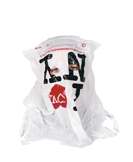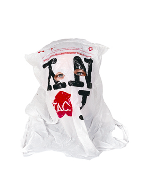 Rather than focusing on figurative representation, Ghost Town uses objects, both sculptural and photographic, in a conceptually narrative way. Much is painted or tinted in an inky black or shades of gray. The walls are lined with minimal, almost mundane photographic floral still-lifes; however, the tip of each flower has been dipped in black paint. The only hints of color in the exhibition can be found in her portraits of people with plastic bags on their heads and crudely cut-out eye holes. In a whirl of frozen moment, gray cement sculptures are placed on pedestals installed throughout the gallery. Favorites are simple backpacks, weighted not only by their shape but also by the physicality of the material. Black motorcycle jackets, also on pedestals face each other having an imaginary, headless dialogue. It’s as if the idea of people were placed around the gallery, maybe biker dudes or members of a leather club, outside a bar or standing on a street corner. Much is left up to the imagination of the viewer. A photograph of an umbrella, recognizable as the type one would purchase on the street out of desperation for a measly $3.00, is sprawled out after what seems to be the result of a horrendous rainstorm, matte black and stark against a white background inside a thin black frame.