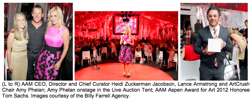 Coinciding with these two recently opened exhibitions, the museum board also organized several events including ArtCrush, WineCrush and PreviewCrush. Each event invited prominent artists, curators, gallerists, collectors and philanthropists to celebrate the Aspen Art Museum. The wine tasting was sponsored by Dom Pérignon and artist Tom Sachs was presented with the AAM’s Aspen Art Award for 2012. The event was hosted by chair Amy Phelan and her husband John. PreviewCrush presented a live auction including artists Jim Hodges, Ryan Gander, Rob Pruitt and others while the silent auction featured artists such as Slater Bradley, Michaël Borremans and Ellen Harvey, just to name a few. Valued prices generously ranged from $2,000 – $150,000 for a Tom Friedman piece titled “Which” from 2008. All sales support the Aspen Art Museum, including tickets to the various dinners, cocktail receptions, etc. held August 1st-3rd.