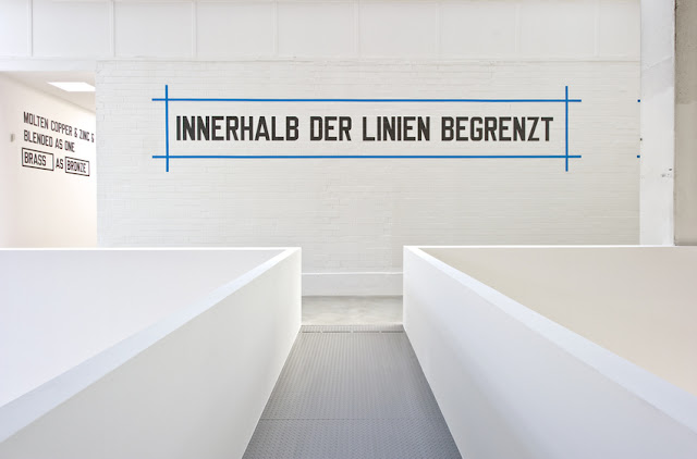 On view at Blain Southern, a gallery that is a recent addition to the Berlin scene having just been located on PotsdamerStrasse for about a year now, is Lawrence Weiner Concentricity Per Se. Lawrence Weiner has been a fixture in New York and on the West coast, so it was refreshing to see his enlarged text based works mixed in both German and English phrases. The work is a testament to language and communication. Here, both German and non-German speakers alike can look at the graphic quality of the work as it communicates something that is either comprehended or not. Not unlike an organized version of graffiti or the slogans we are fed through advertisers, Weiner’s text works are bold and not easily ignored. Blain Southern is huge and the high ceilings and spacious second floor are made to well curated. Kudos to the staff for not overwhelming the space with works but rather installing a particular amount of works, that is what Per Se seems to be all about working with particular restraints.