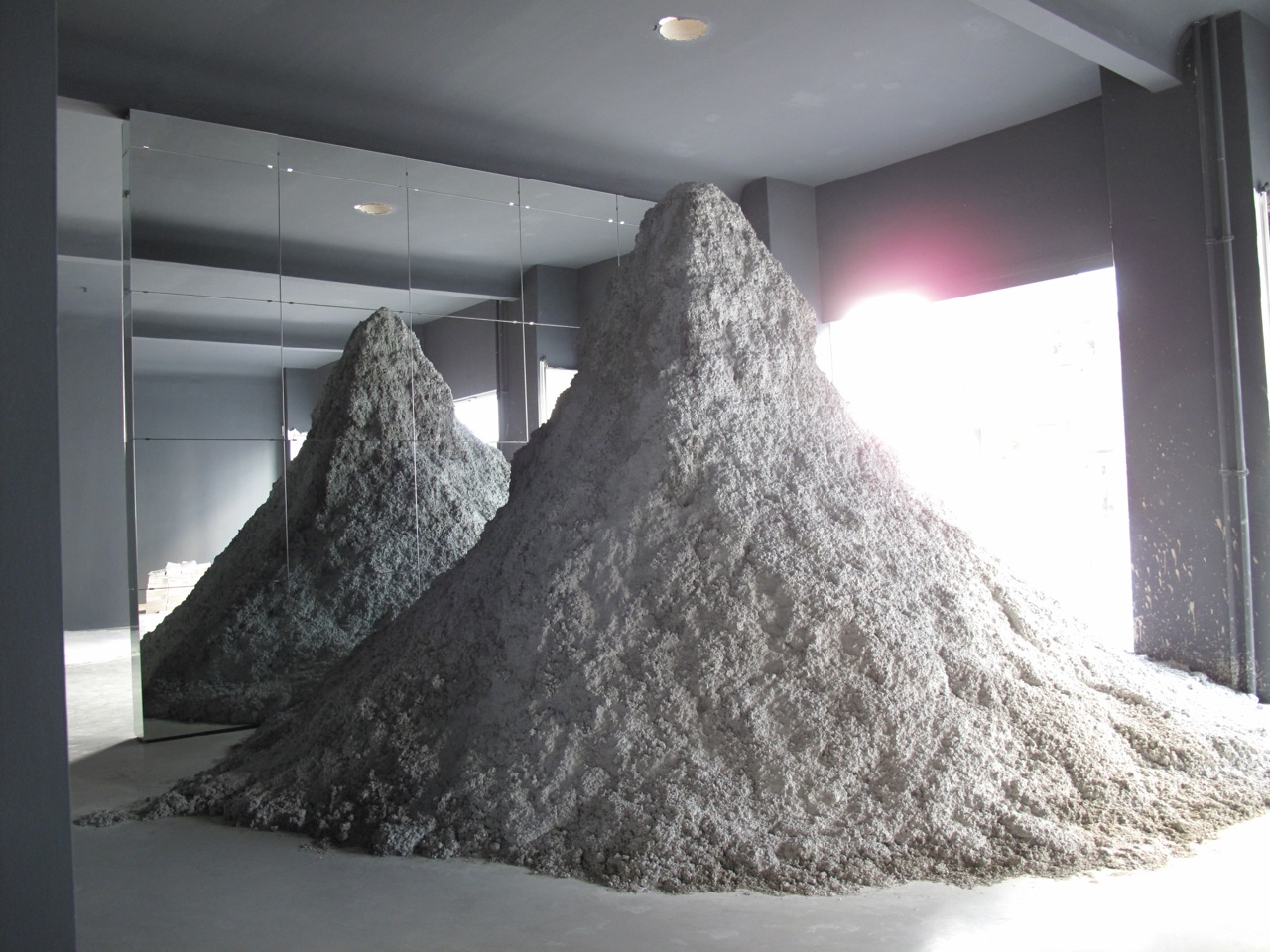 First up on the list is an exhibition by Berlin architect Arno Brandlhuber titled Archipelago. His first solo show in a gallery context, Brandlhuber has been a regular fixture at the Venice Architecture Biennale (2012, 2008, 2006, 2004) and also designed a Pavilion with artist Thomas Demand for the São Paolo Biennale in 2004. For his exhibition at Neuer Berliner Kunstverein (NBK) Brandlhuber utilized holes in the gallery ceiling from a previous exhibition and poured cement into the space allowing for a spatial intervention. The cement is present throughout the gallery sometimes in what could be described as enlarged ant holes or flattened organic mounds while bits of cement decorate the nearby walls and mirrored surfaces.