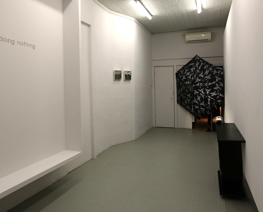 The result of this interest and obsession, is evident in the large umbrella, with a crystallized black and grey Art Deco pattern, propped in the back corner of the gallery. The umbrella blocks part of the space, including a doorway that normally leads to a back room. The purposeful obstruction is both a curious visual ploy lending itself to spatial distraction and also a symbol, that in this case pertains to privacy, shelter and a desire to shield one’s identity.