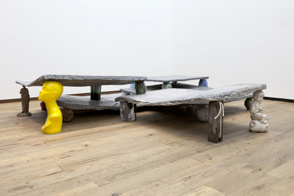 Carolyn Salas, Self Portrait, 2013, concrete, ceramic, found objects, 16 x 102 x 94 inches.