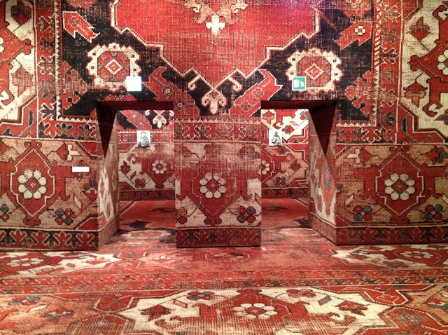 For this exhibition, Stingel has once again utilized carpet. Upon first entering the space, the expansive, Oriental patterned carpet seems a bit out of the ordinary for Venice and even somewhat pixelated upon closer inspection. It appears to show a bit of wear from visitors over time and with the impressive history of the François Pinault Foundation, the show of usage could at first be expected. Walking up to the first level above the canals, reveals that the entire interior of the building has been covered in the decorative carpet, floors and walls. This is not the first time that Rudolf Stingel has used carpet as his choice of medium and another was recently on view in NYC 1993: Experimental Jet Set, Trash and No Star at the New Museum. The exhibition is his largest monographic presentation in Europe and tracks the signs of visitors and also offers a selection of paintings ranging from conceptual abstraction to figuration.