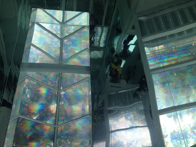 (Mirrored installation with reflective, prism inducing material on windows, pitch black room)
